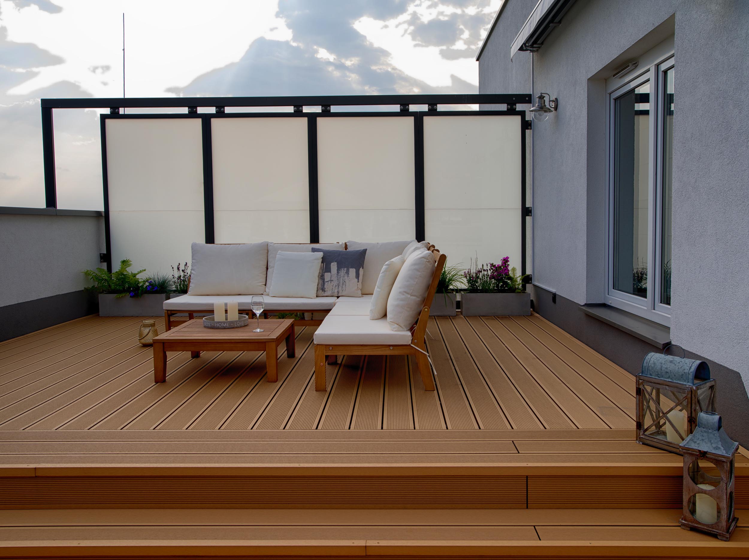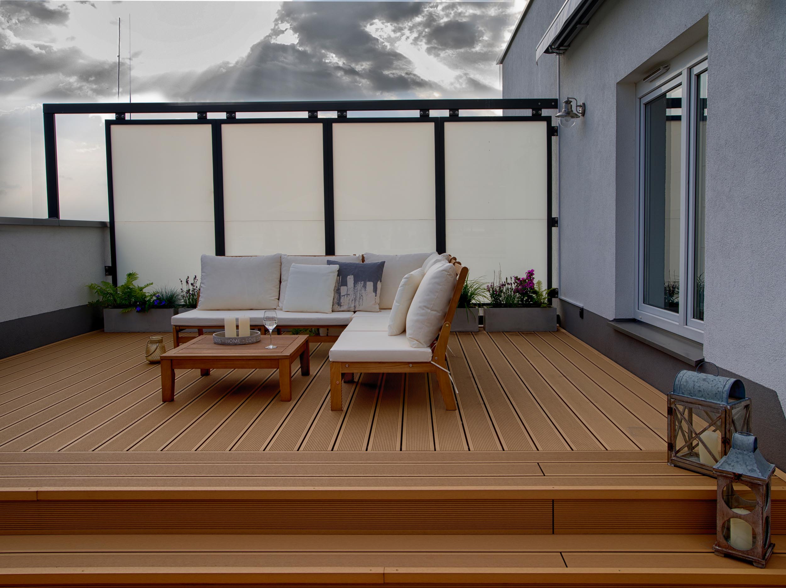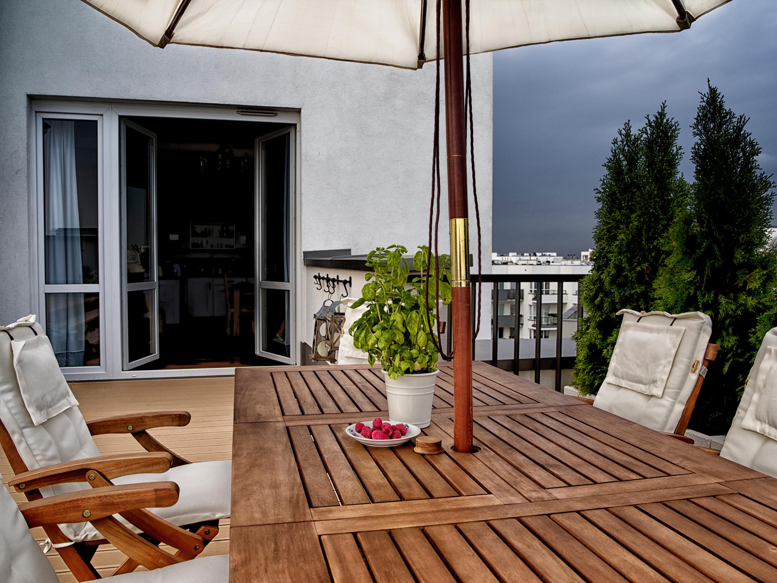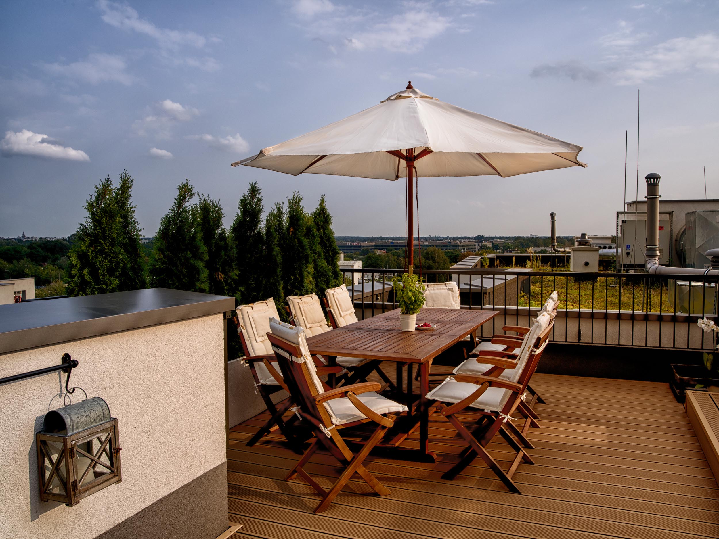 Właściciele przedstawianego tarasu niezwykle cenią sobie życie rodzinne oraz wspólny wypoczynek. Dlatego w przestrzeni wydzieliliśmy dwie strefy: strefę relaksu i strefę jadalnianą, stanowiącą przedłużenie kuchni latem.