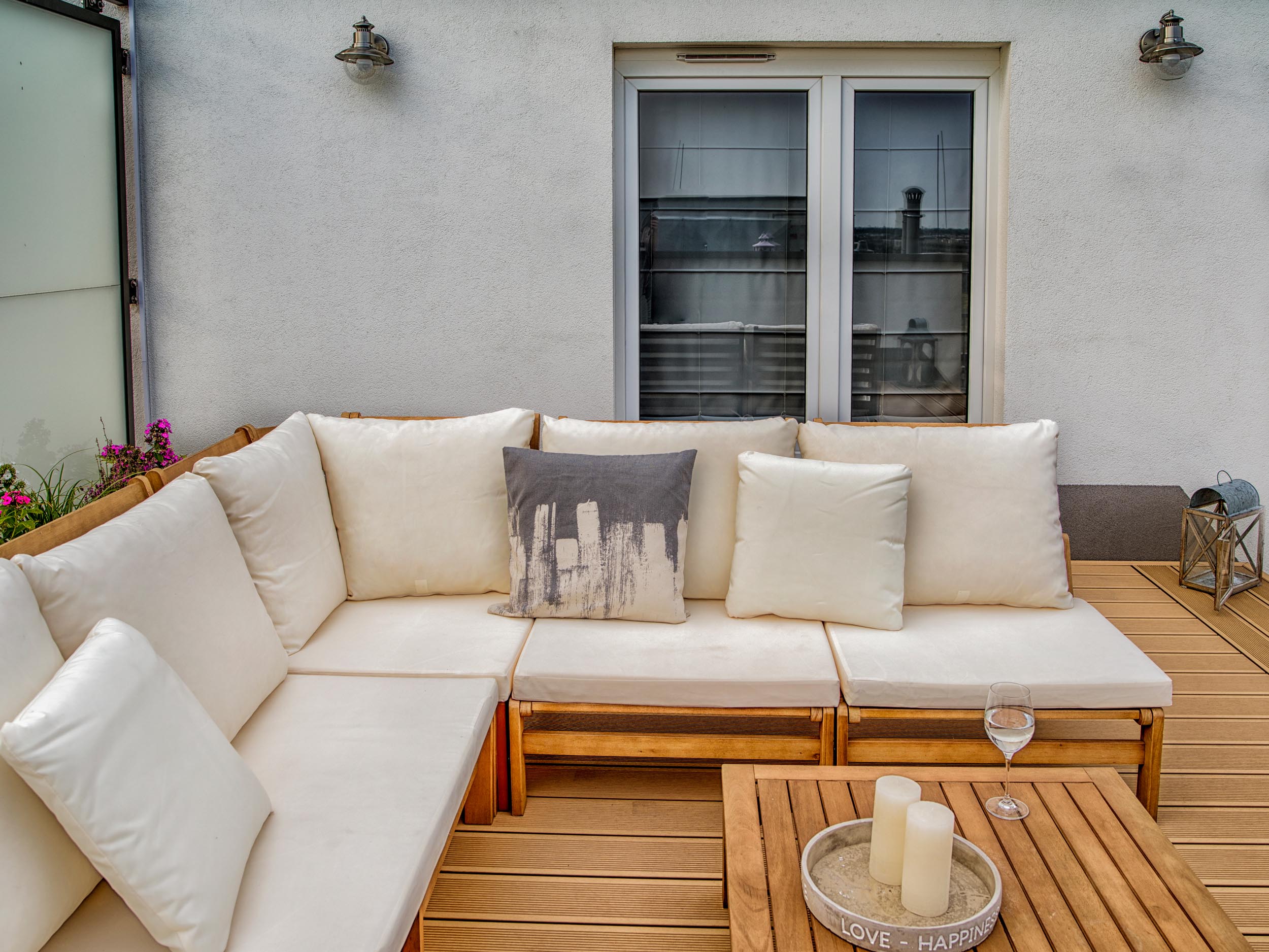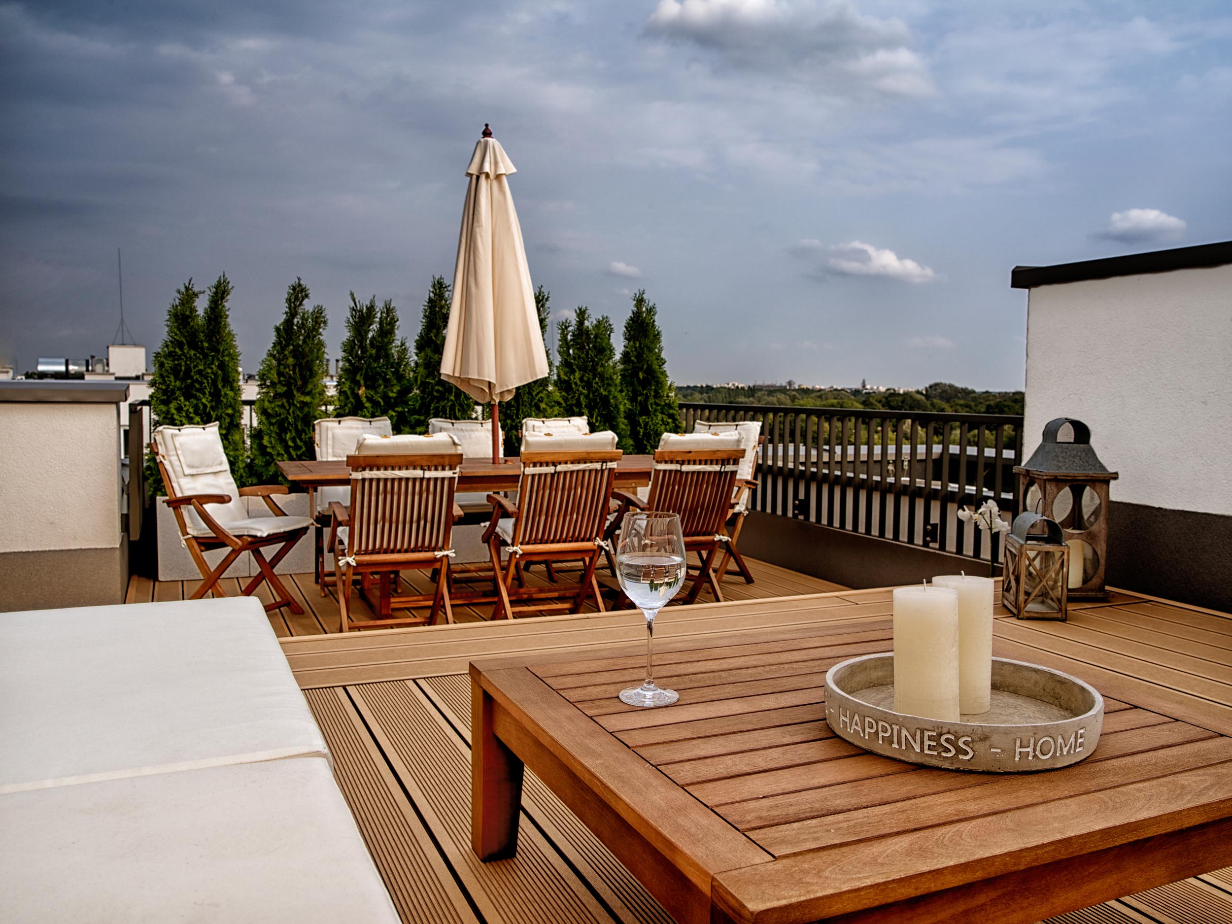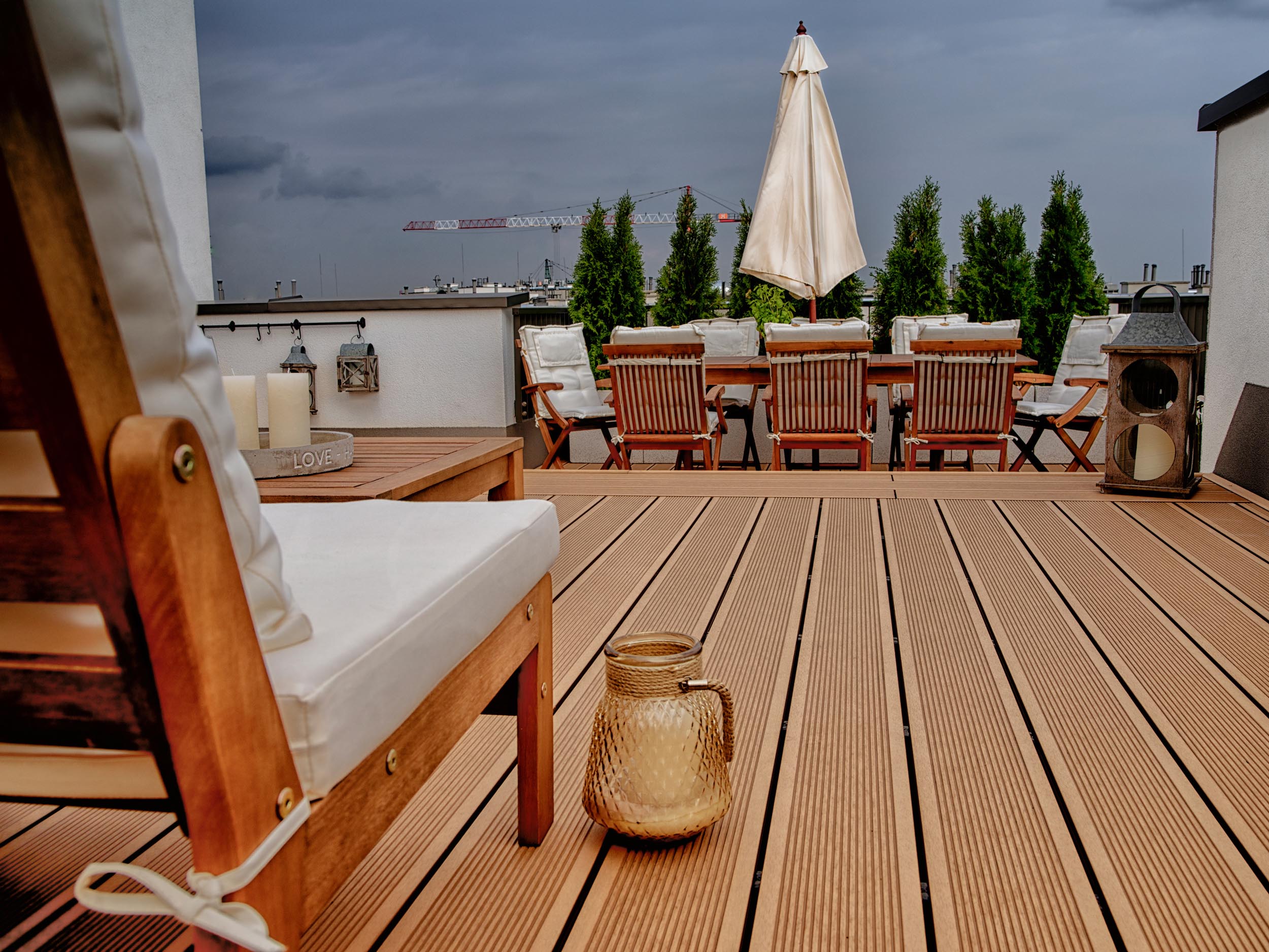 Właściciele przedstawianego tarasu niezwykle cenią sobie życie rodzinne oraz wspólny wypoczynek. Dlatego w przestrzeni wydzieliliśmy dwie strefy: strefę relaksu i strefę jadalnianą, stanowiącą przedłużenie kuchni latem.