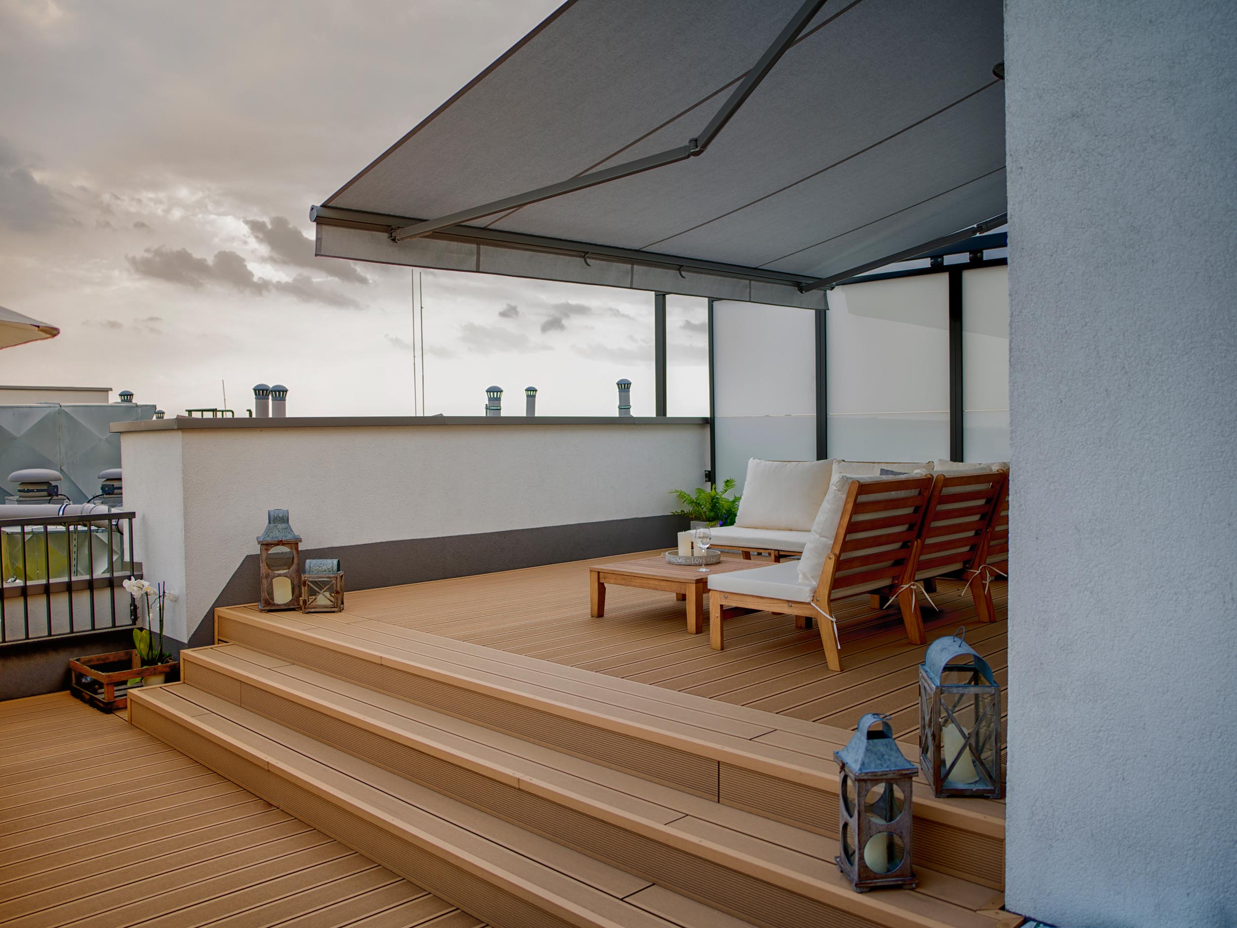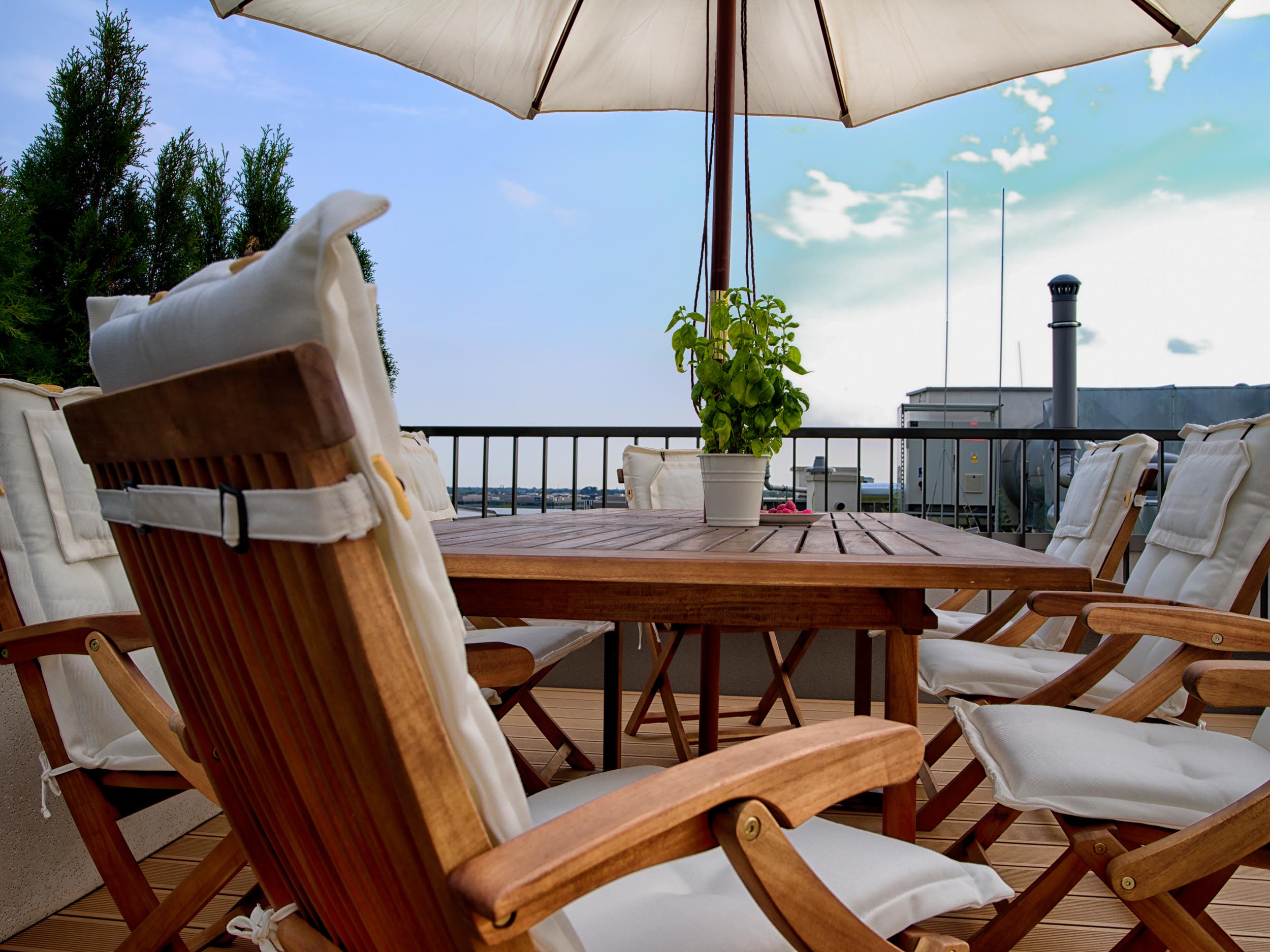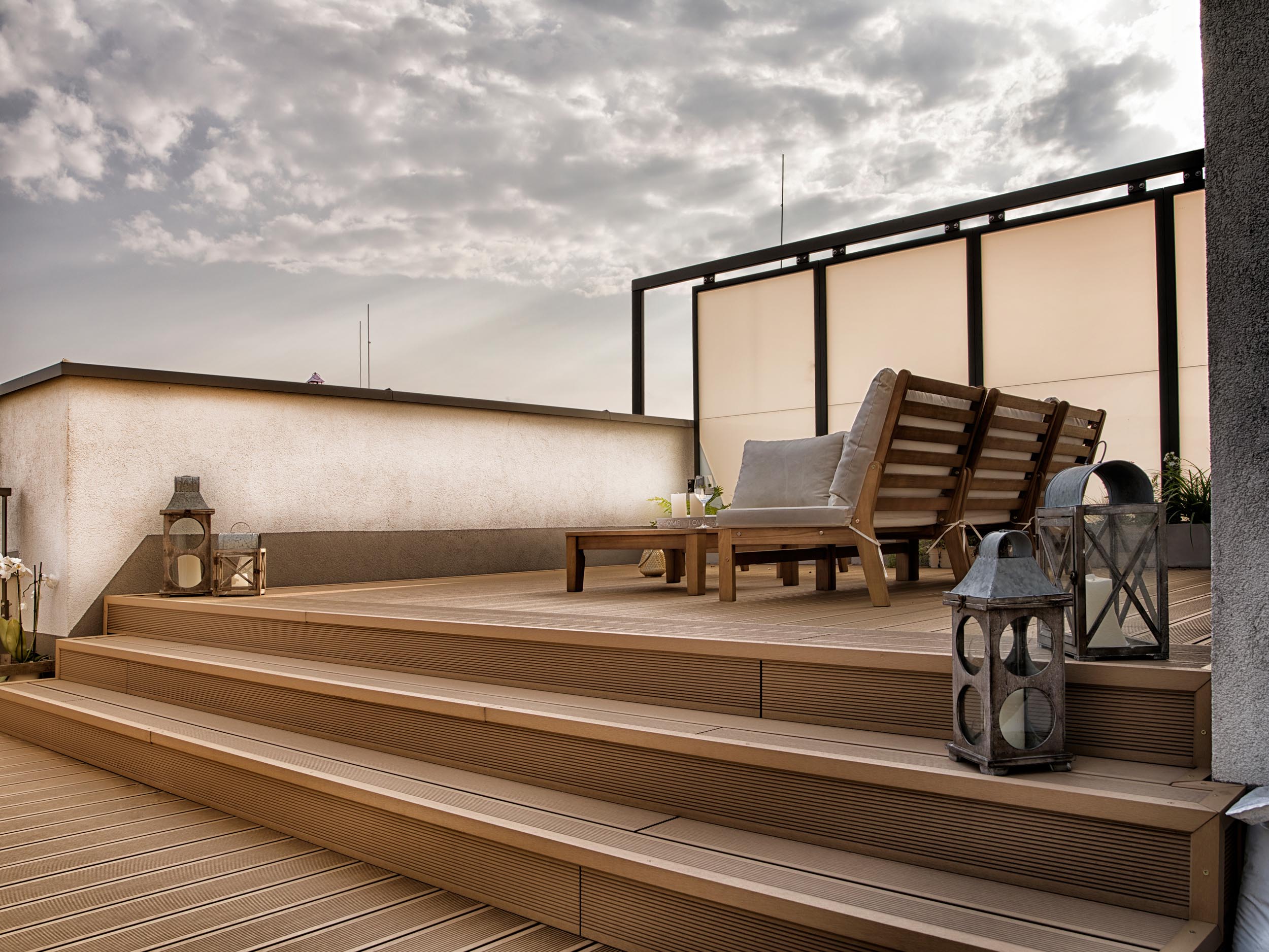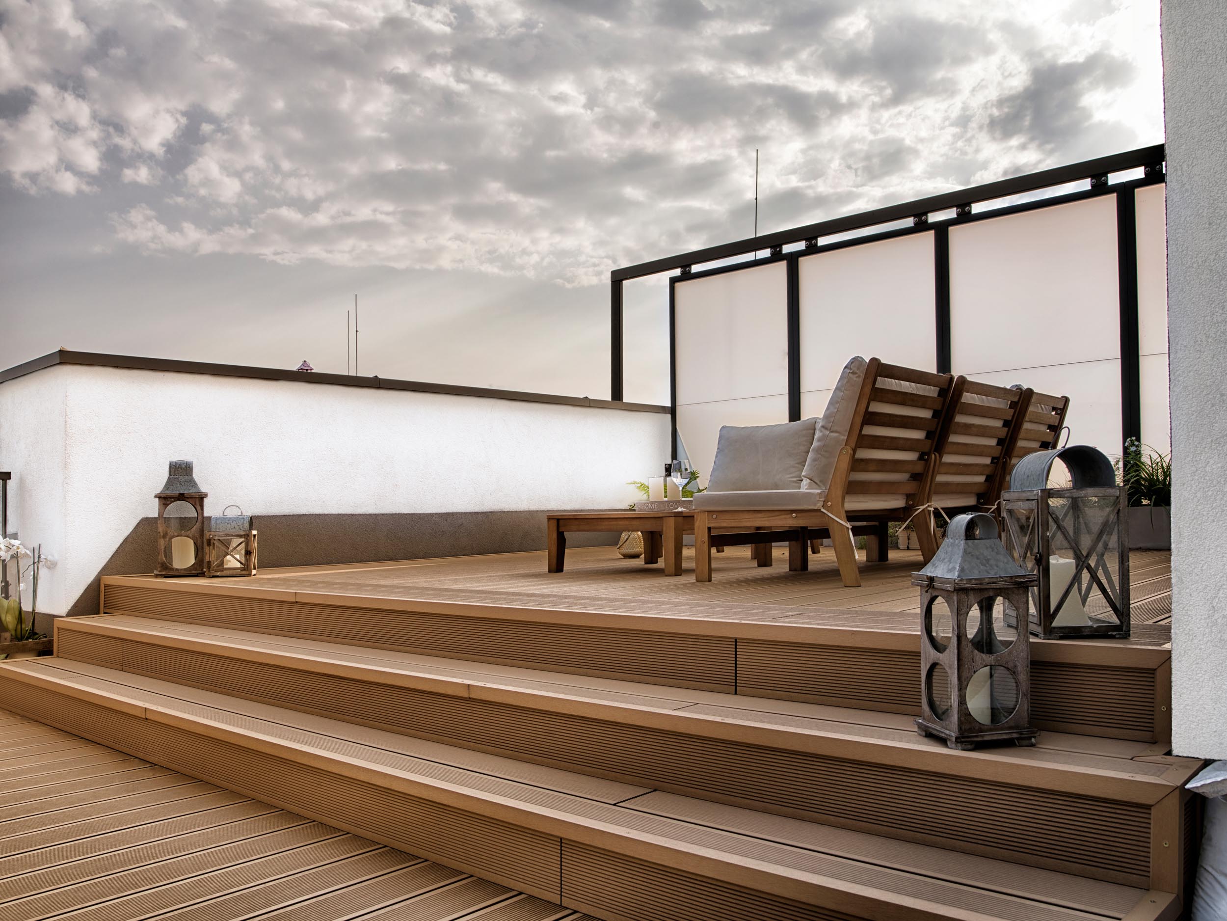 Właściciele przedstawianego tarasu niezwykle cenią sobie życie rodzinne oraz wspólny wypoczynek. Dlatego w przestrzeni wydzieliliśmy dwie strefy: strefę relaksu i strefę jadalnianą, stanowiącą przedłużenie kuchni latem.